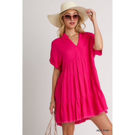 Hot Pink V Neck Collared Tiered Frayed Hem Short Sleeve Dress