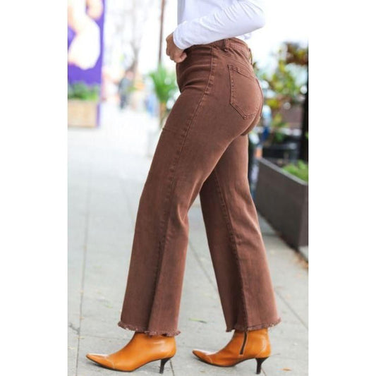 High Waist Straight Acid Wash Frayed Cutoff High Waist Jeans, BROWN