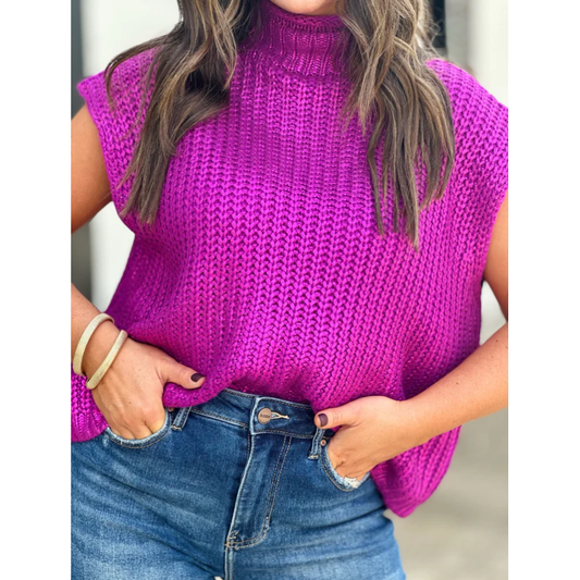 Metallic Foiled Mock Neck Cap Short Sleeve Sweater, PURPLE