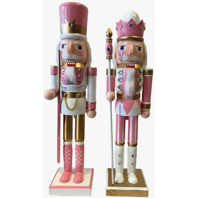 Crisp and precise in their shiny bejeweled uniforms, these nutcrackers will give your holiday display an instant shot of pink and gold pizzazz! Each nutcracker has a distinctive outfit and headpiece and stands securely on a sturdy wooden base. Beautifully handcrafted from wood and hand painted, this set of two 14" Pink & Gold Nutcrackers are sure to provide many seasons of pleasure.