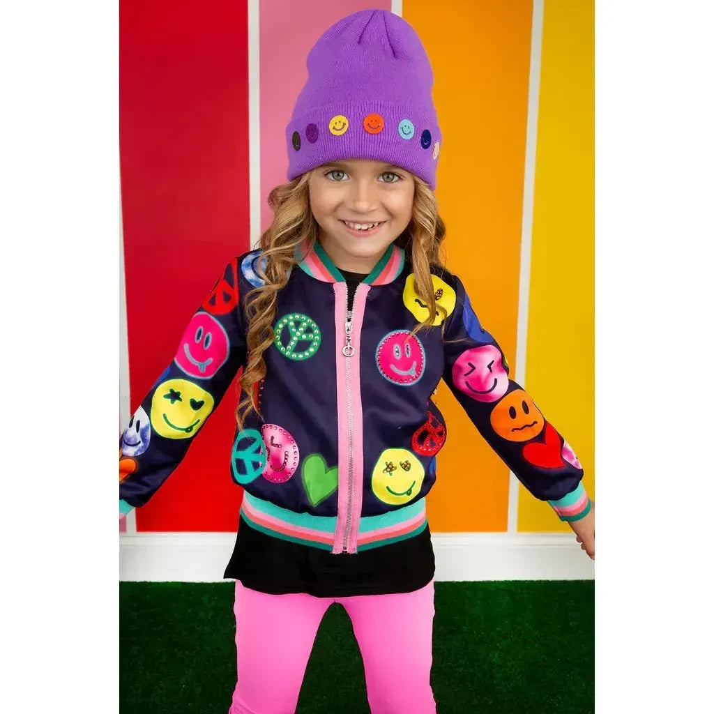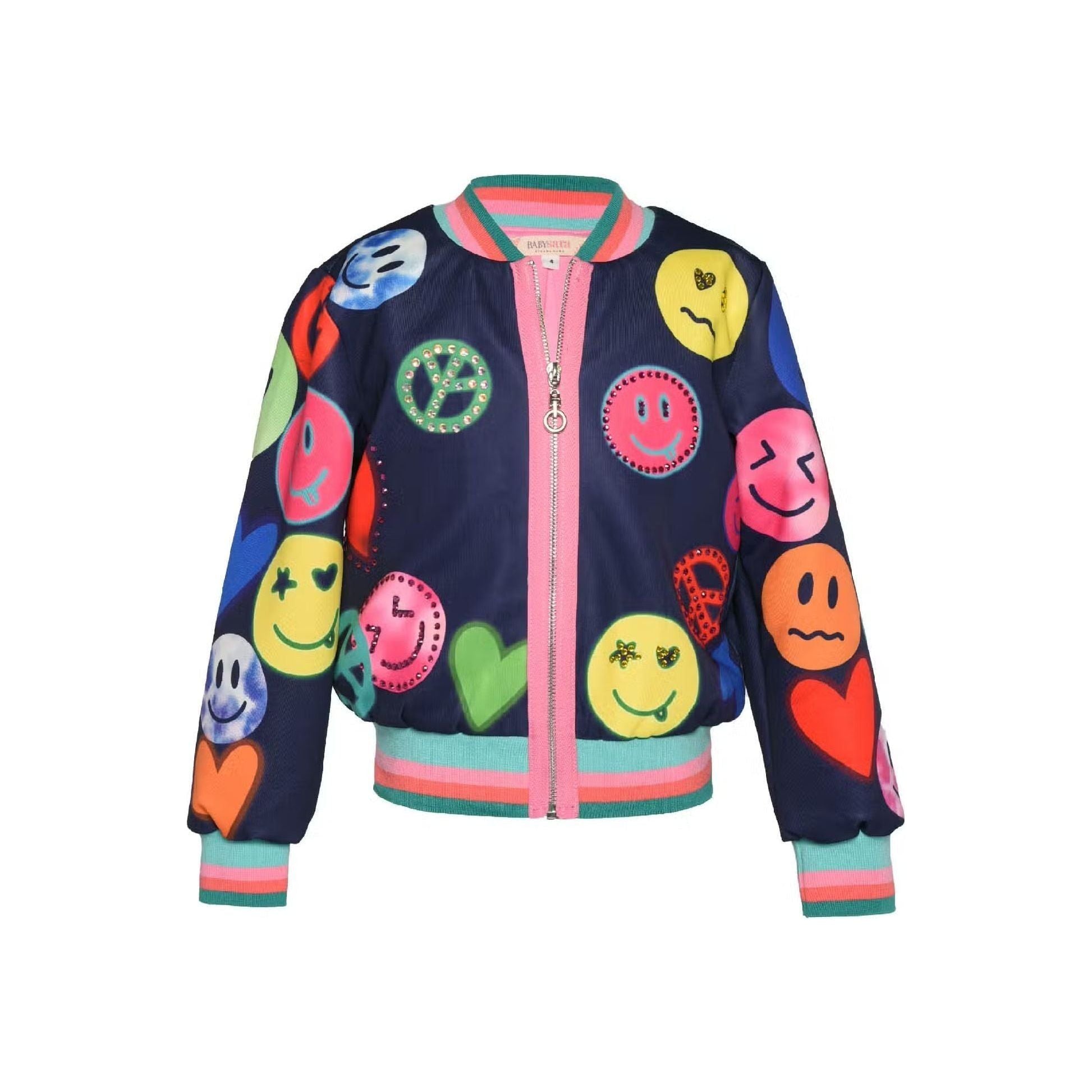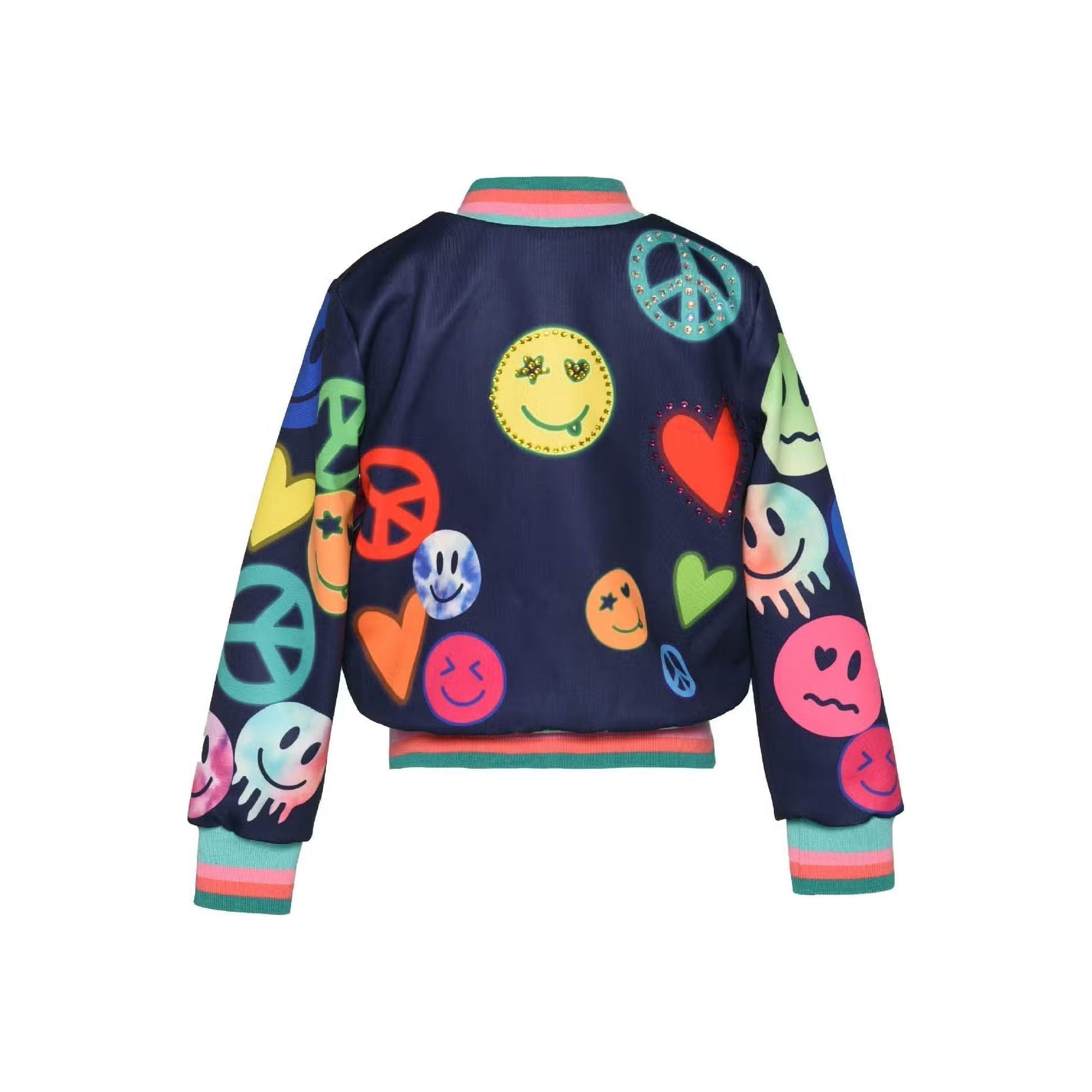 Get ready to spread some serious happiness with our girls' smiley face bomber jacket! This funky and fabulous piece is all about the good vibes and cheerful style. The iconic smiley face emblem print all over brings a burst of joy and positivity to any outfit. Made with soft and cozy materials, this jacket is perfect for cool weather adventures or just adding a playful touch to her everyday look.