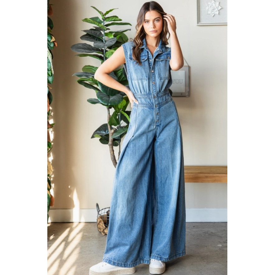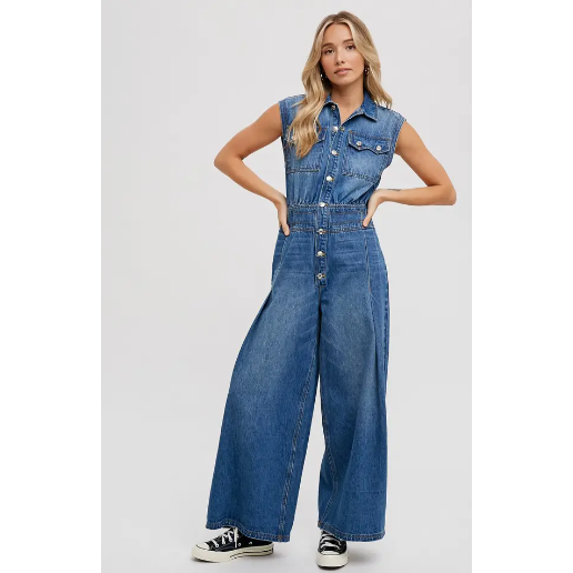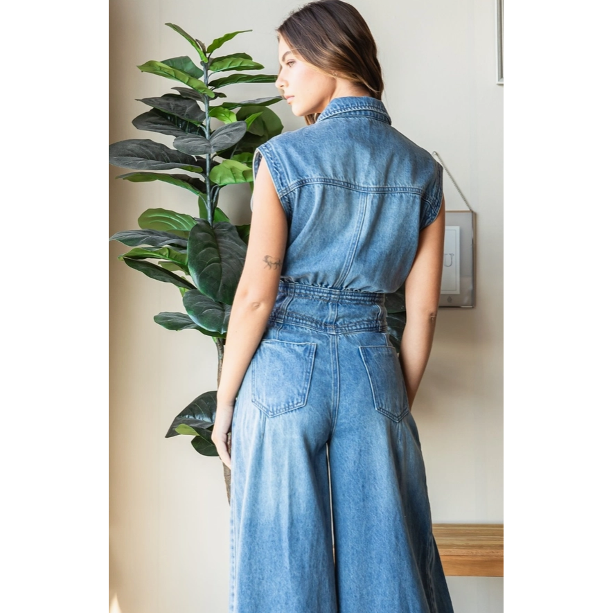 The denim sleeveless shirt jumpsuit is a stylish and versatile garment that combines the classic charm of denim with the ease and comfort of a jumpsuit. It features a sleeveless design with a button-down front, resembling a shirt, and a tailored bottom that flows into pants or shorts. This piece offers a casual yet trendy vibe, ideal for various occasions, from casual outings to relaxed gatherings.