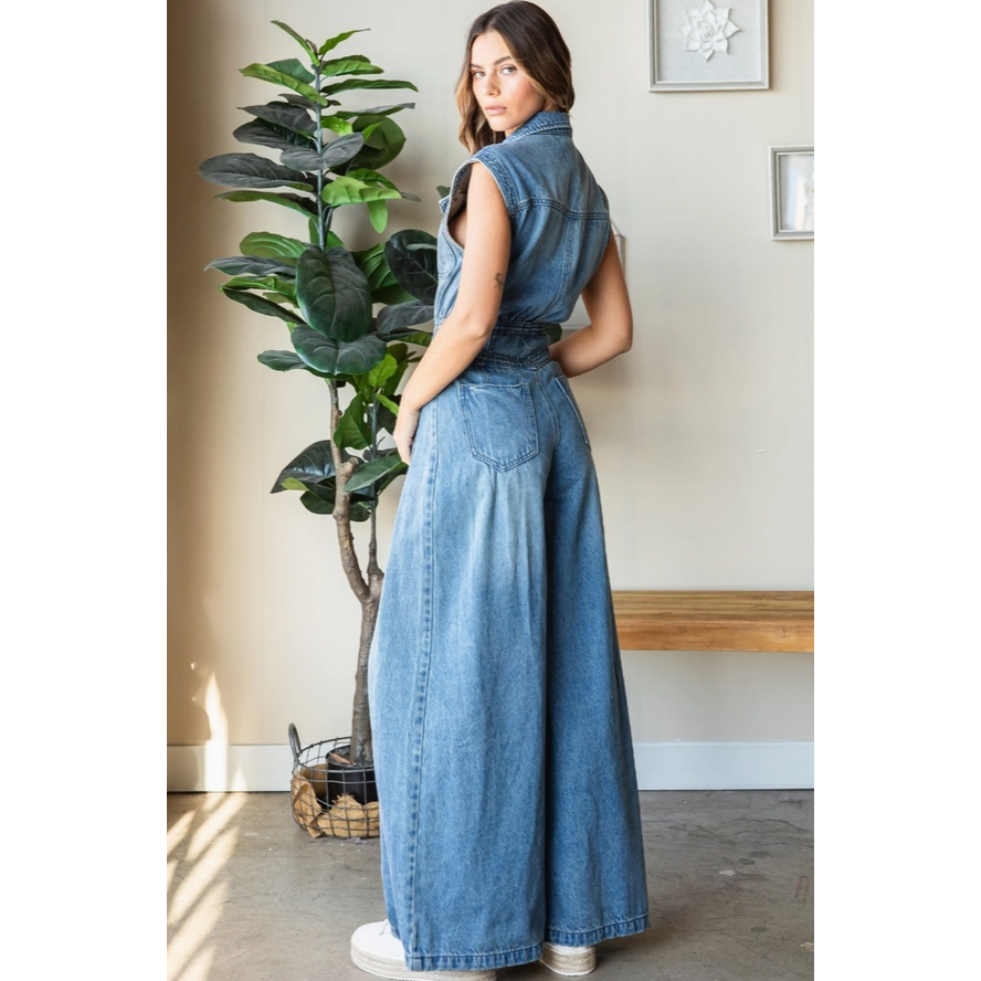 Veveret Denim Button Down Sleeveless Jumpsuit/Romper