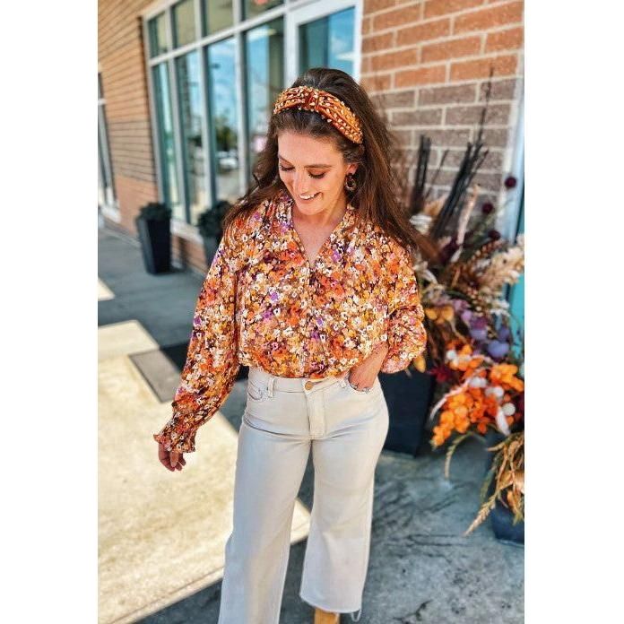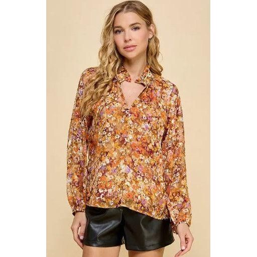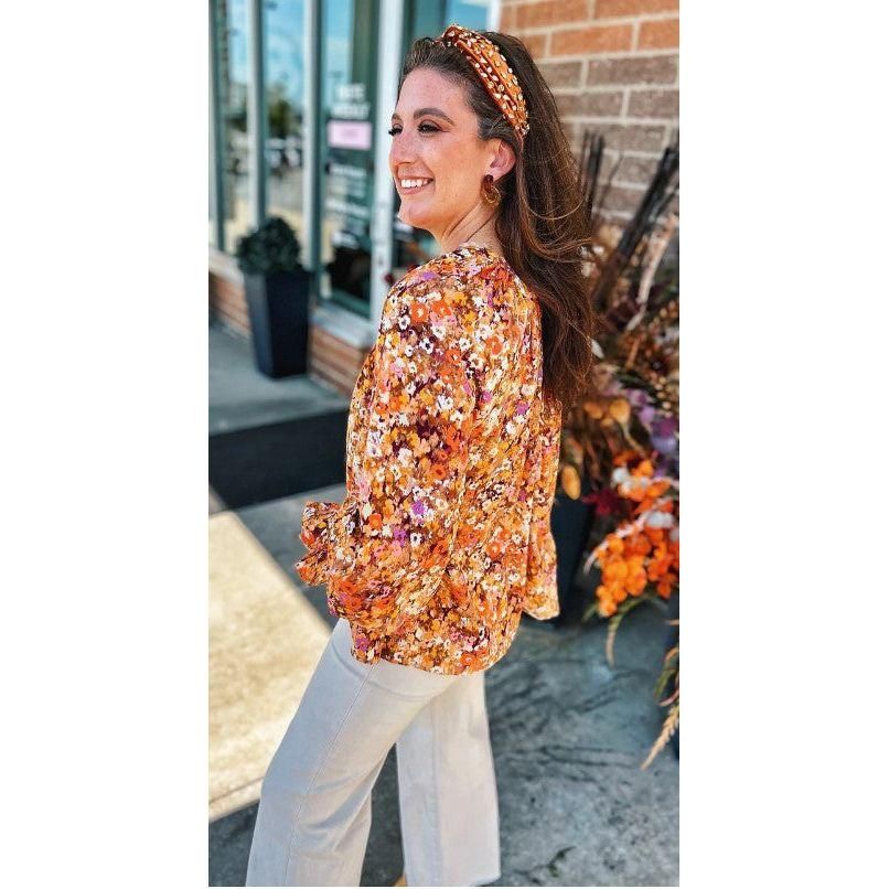 Floral print long sleeve top featuring functional buttons at front. Smocking at cuff and neck. Lined. Woven. Non-sheer. Lightweight.