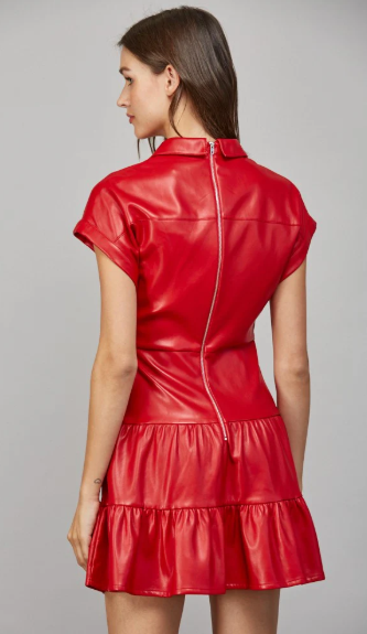 Faux patent leather minidress. Has open spread collar and a twisted front detail. A tiered skirt completes the look.