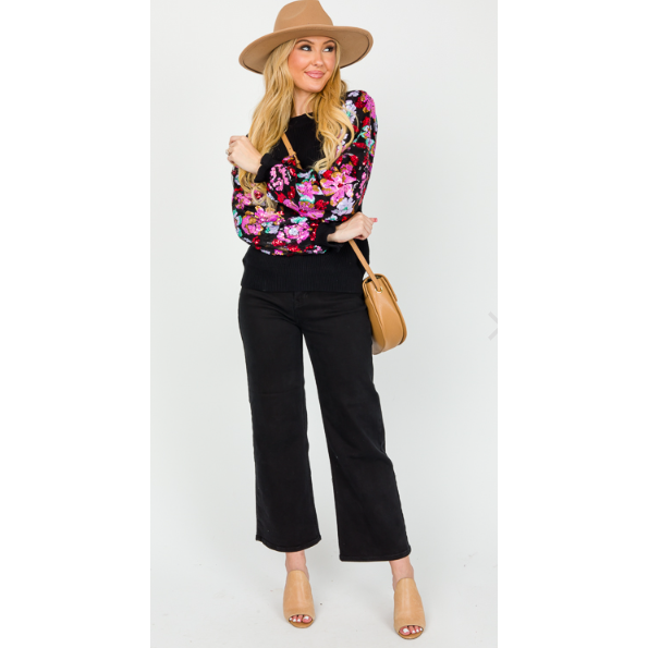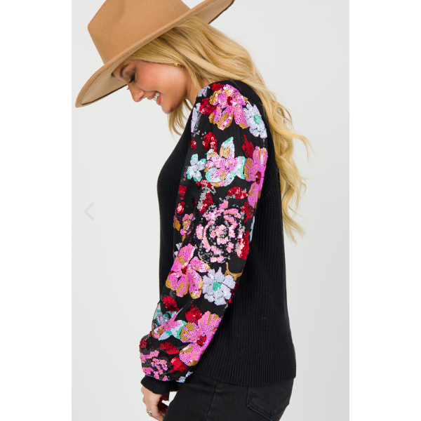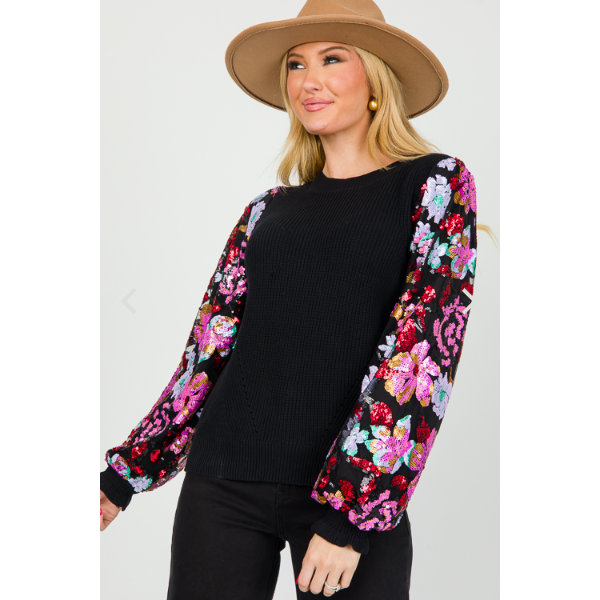 We never knew that a sweater could be this fabulous! Black sweater knit body met with vibrant sequin floral mesh balloon sleeves.