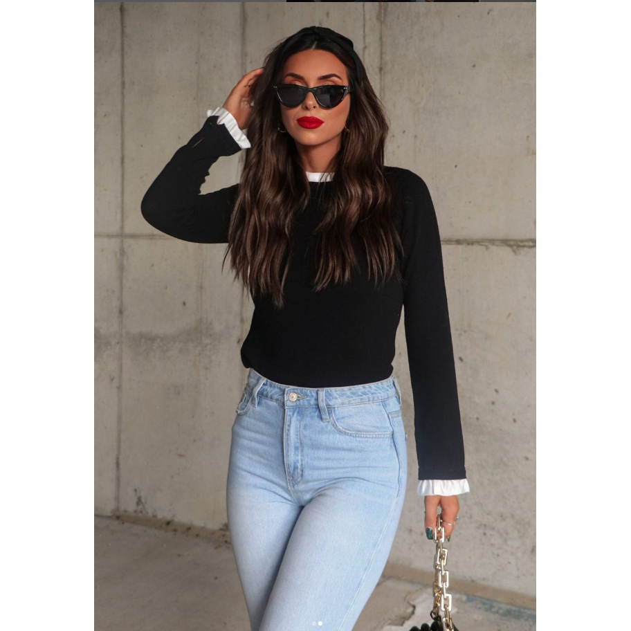 Look so posh and polished in our France Contrast Ruffle Sweater Top! This black knit sweater has a white contrast ruffle neckline and sleeve hems with a back neckline button closure.