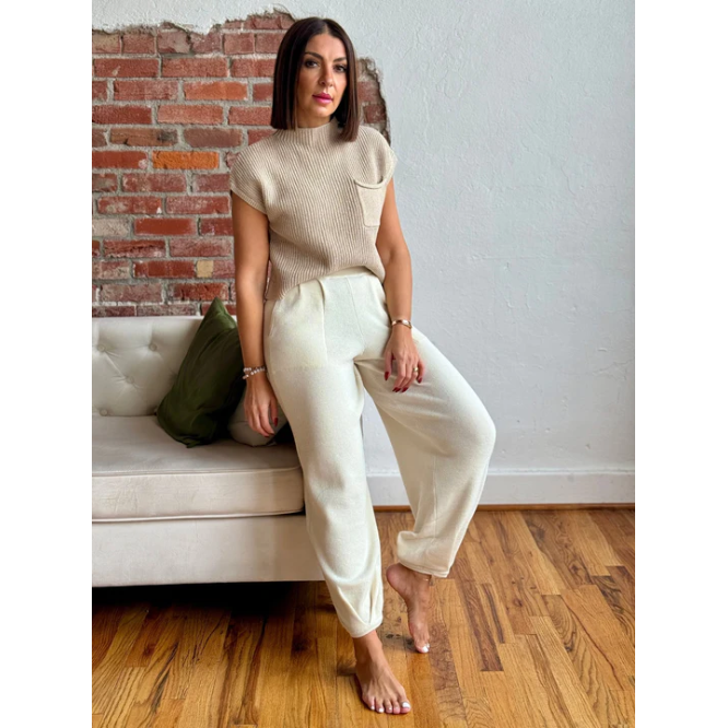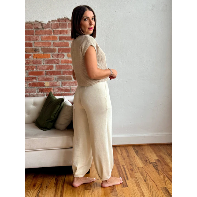 - Features a knit top and coordinating tapered pants for the perfect wear-everywhere outfit.