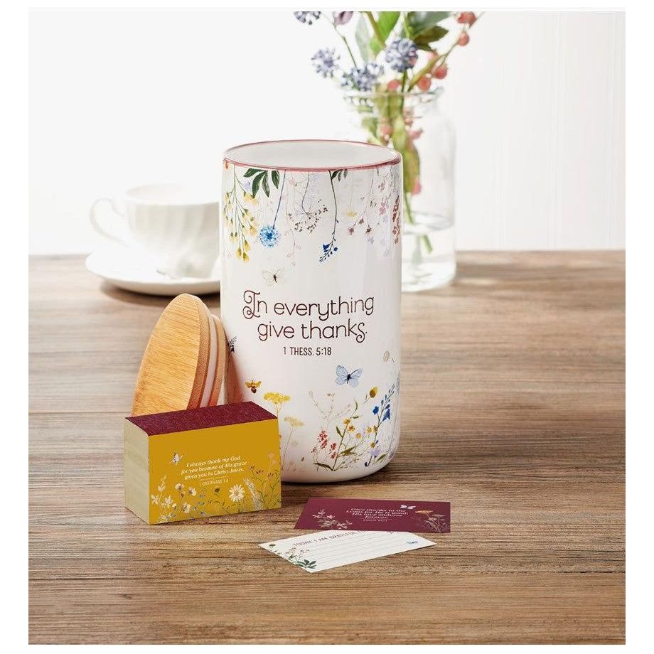 The Give Thanks Topsy-Turvy Wildflower Ceramic Gratitude Jar is part of the Give Thanks Topsy-Turvy Wildflower Collection designed to celebrate the Thanksgiving season. This collection includes a reusable shopping tote, ceramic coffee mug, and gift bag.Mother, Father, Sister, Brother, or Friend! These cards are a wonderful way to stay in the Word on the go!