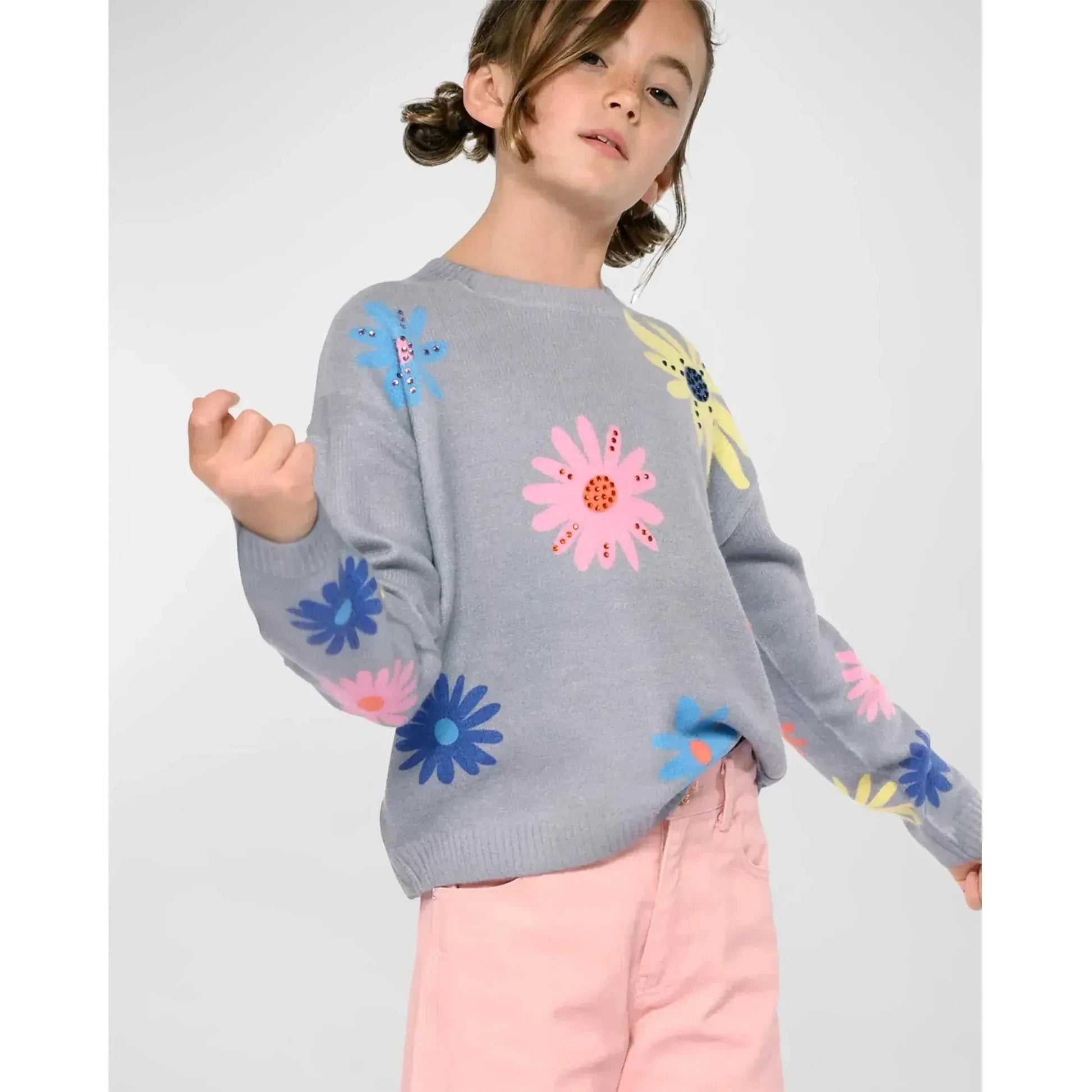 - Hannah Banana sweater decorated with multicolor embellished floral graphics