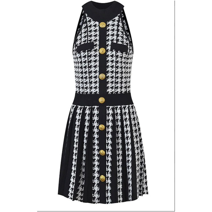 Stay on top of the trends in this Houndstooth pleated mini dress featuring a sleeveless, high neckline mini dress with gold button detailing, a houndstooth print, and a pleated skirt design.