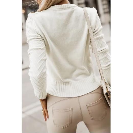 Ivory Cable Knit Sweater with Rhinestone Button Shoulder