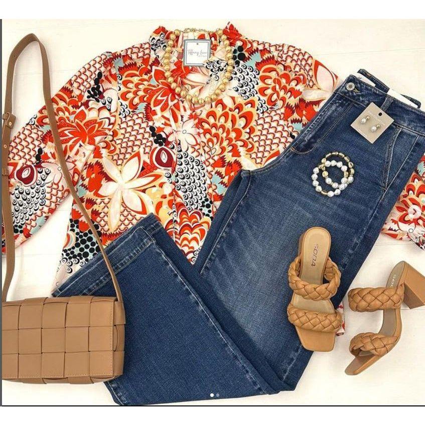 The print on this top is gorgeous and is perfect for warm weather. With a vivid floral print, you can brighten up any outfit with this top.