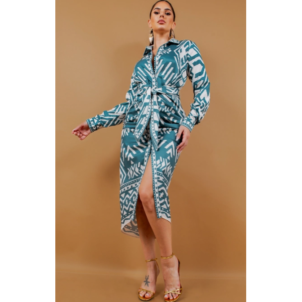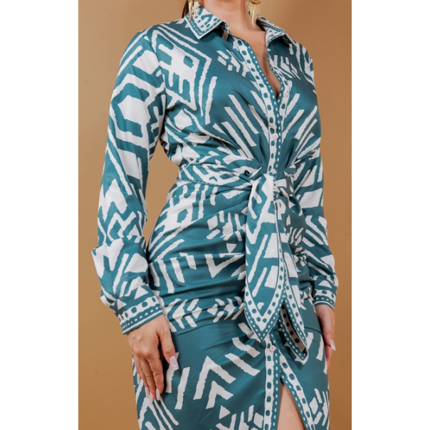 Midi length dress shirt dress. Button Down tie front sash belt in the front. Ruched mid section detail to create an alluring flat front fitting bodice.