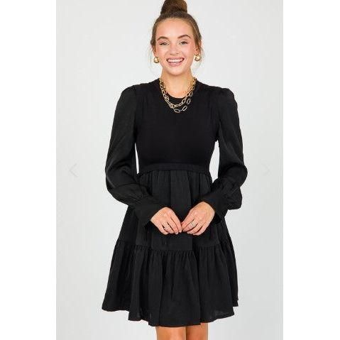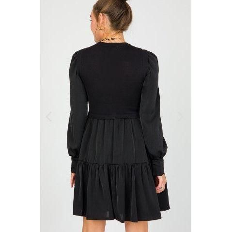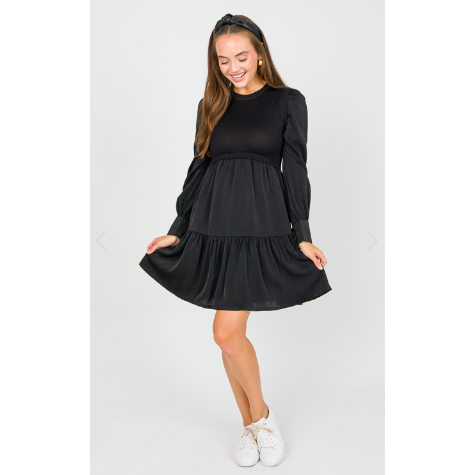 This mix media black dress isn't lacking in preppy style. The stretchy sweater knit bodice is met with a satin smooth tiered skirt and satin long sleeves. The wrists have a functional tie detail.