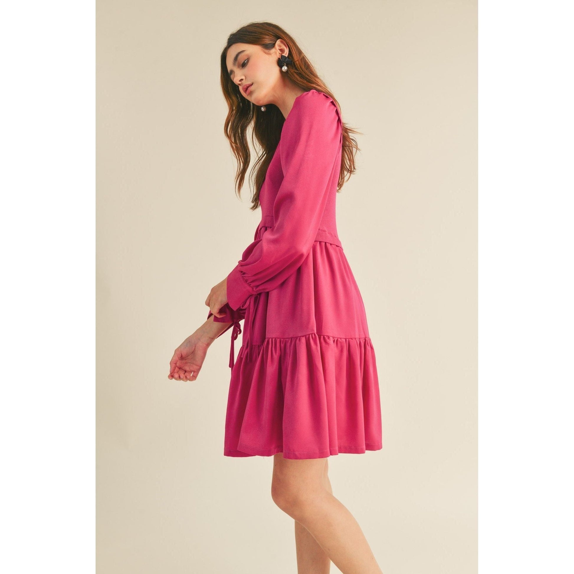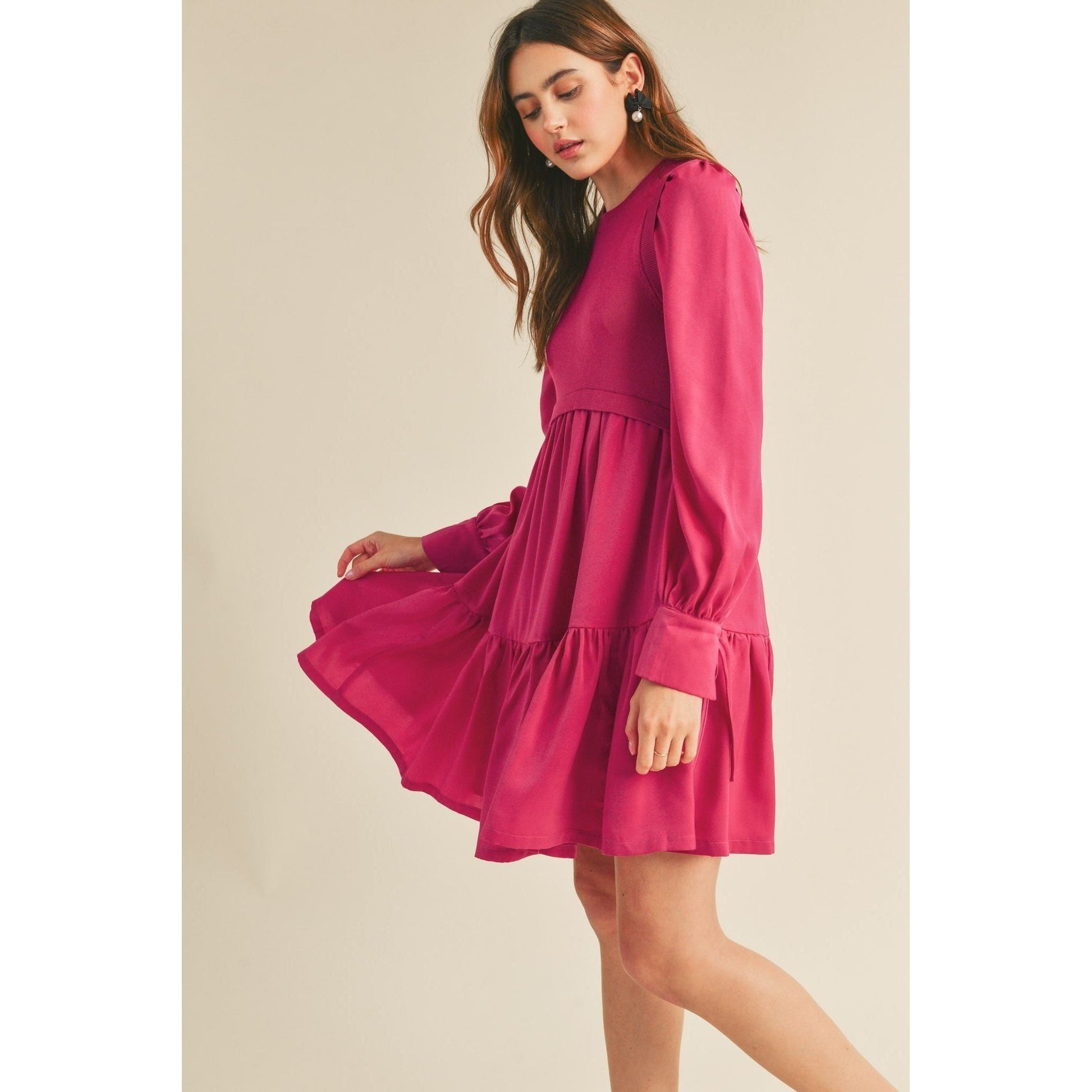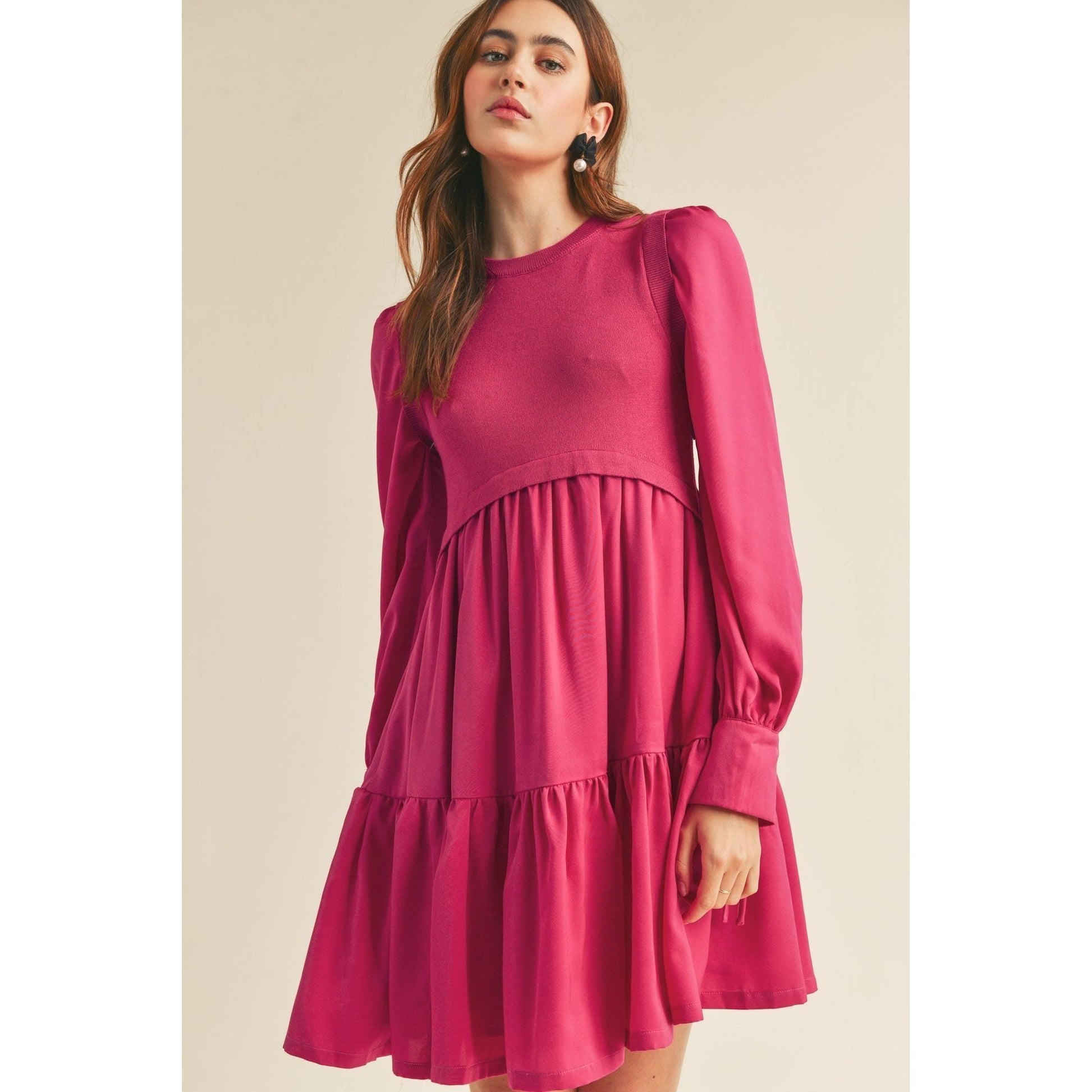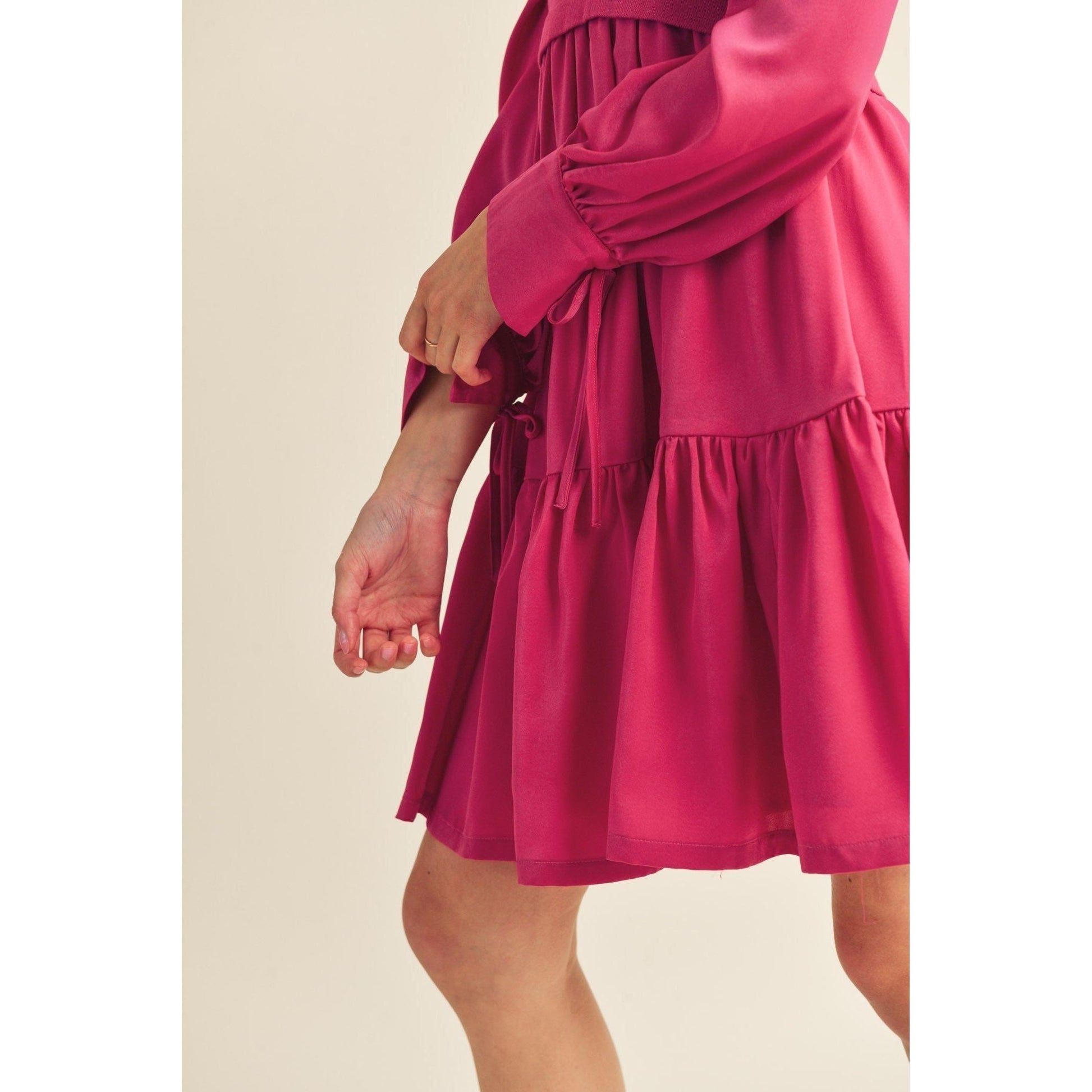 This mix media black dress isn't lacking in preppy style. The stretchy sweater knit bodice is met with a satin smooth tiered skirt and satin long sleeves. The wrists have a functional tie detail.