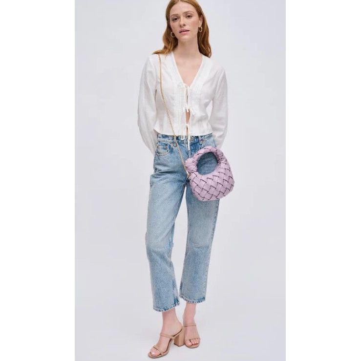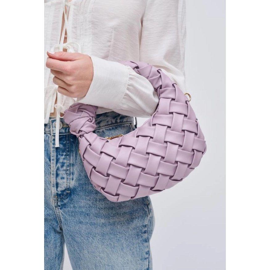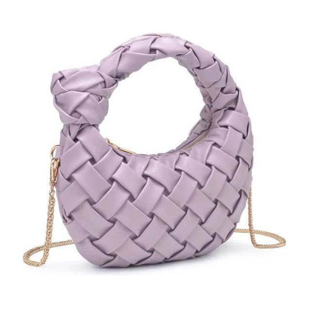 *Exterior Details: Smooth Vegan Leather Woven Design, Knotted Handle, Detachable Chain Strap *Interior Details: Printed Fabric Lined, 1 Zip Pocket