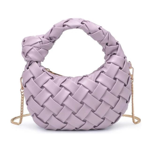 Crafted from smooth vegan leather with an intricate woven design, its knotted handle adds a touch of uniqueness. Carry it as a clutch or use the detachable chain strap for a hands-free experience, all while keeping your belongings organized in the printed fabric-lined interior with a convenient zip pocket.
