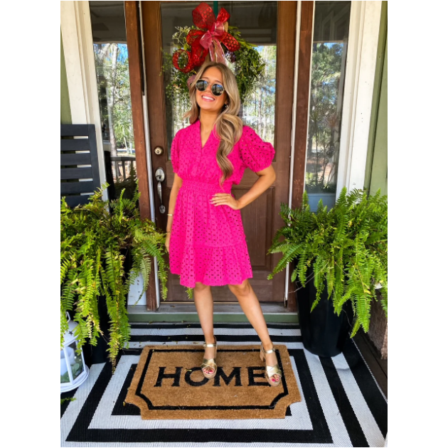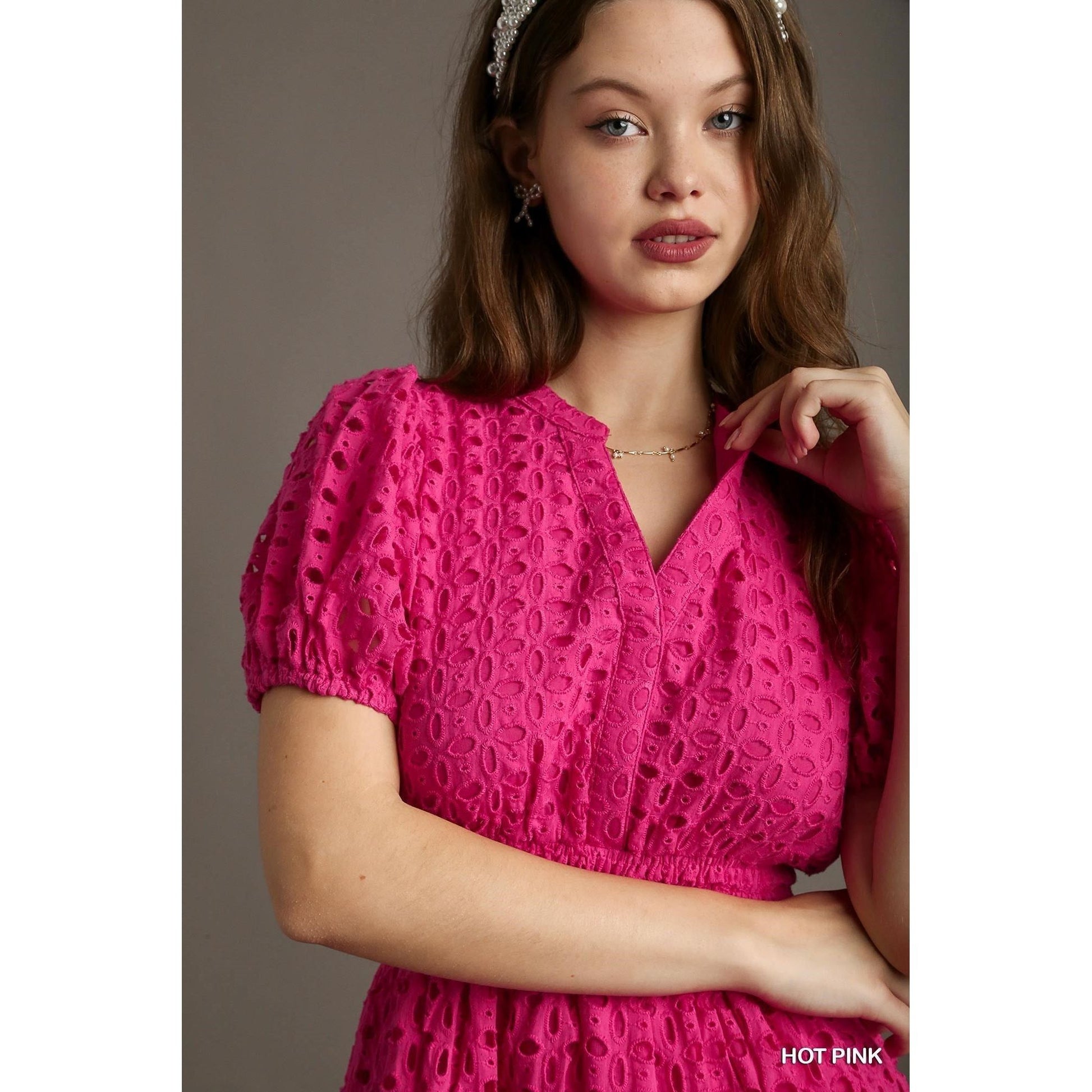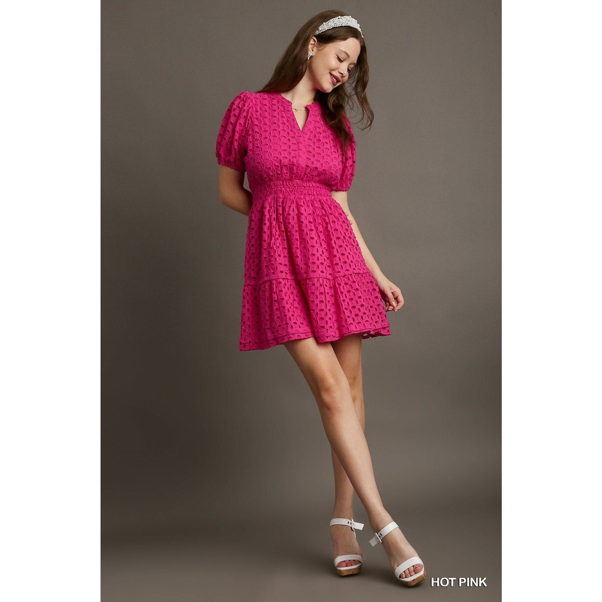 Eyelet Magenta Puff Sleeve Smocked Waist Dress