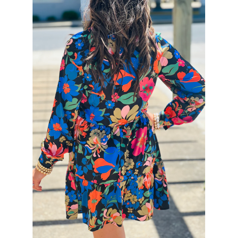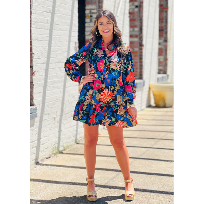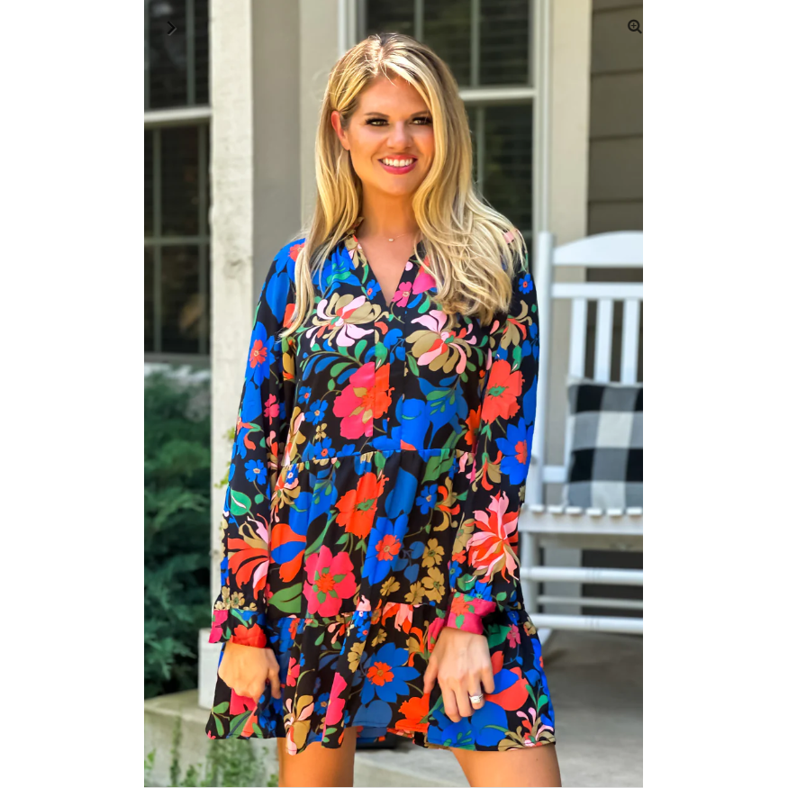 This is the babydoll dress of your dreams! That bold floral print is absolutely perfect for early the holiday season! The fabric is lovely too! You are going to love styling this dress with everything from boots to heels! This dress features a babydoll fit, long sleeves, a v-neck, and a bold floral print.