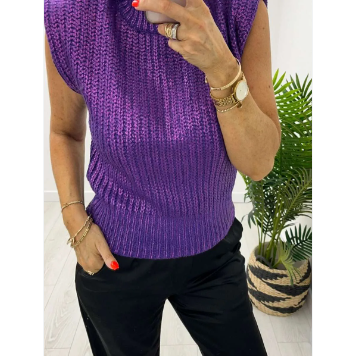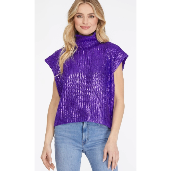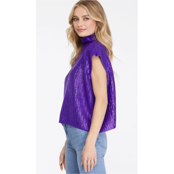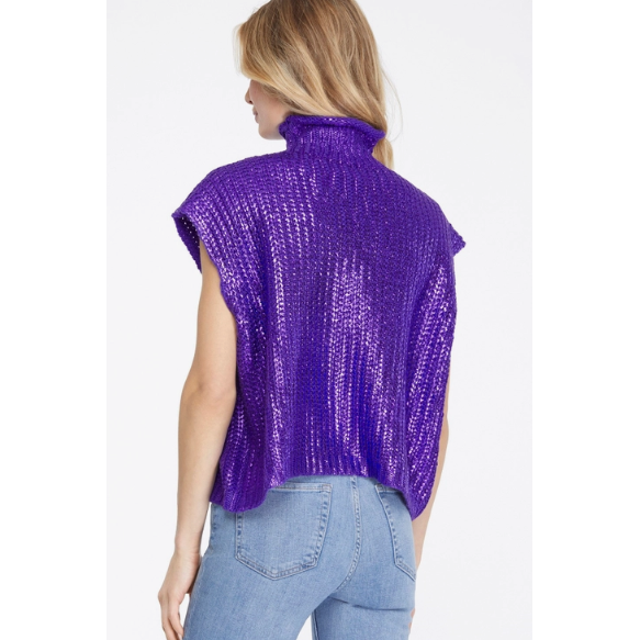 Metallic Foiled Mock Neck Cap Short Sleeve Sweater, PURPLE