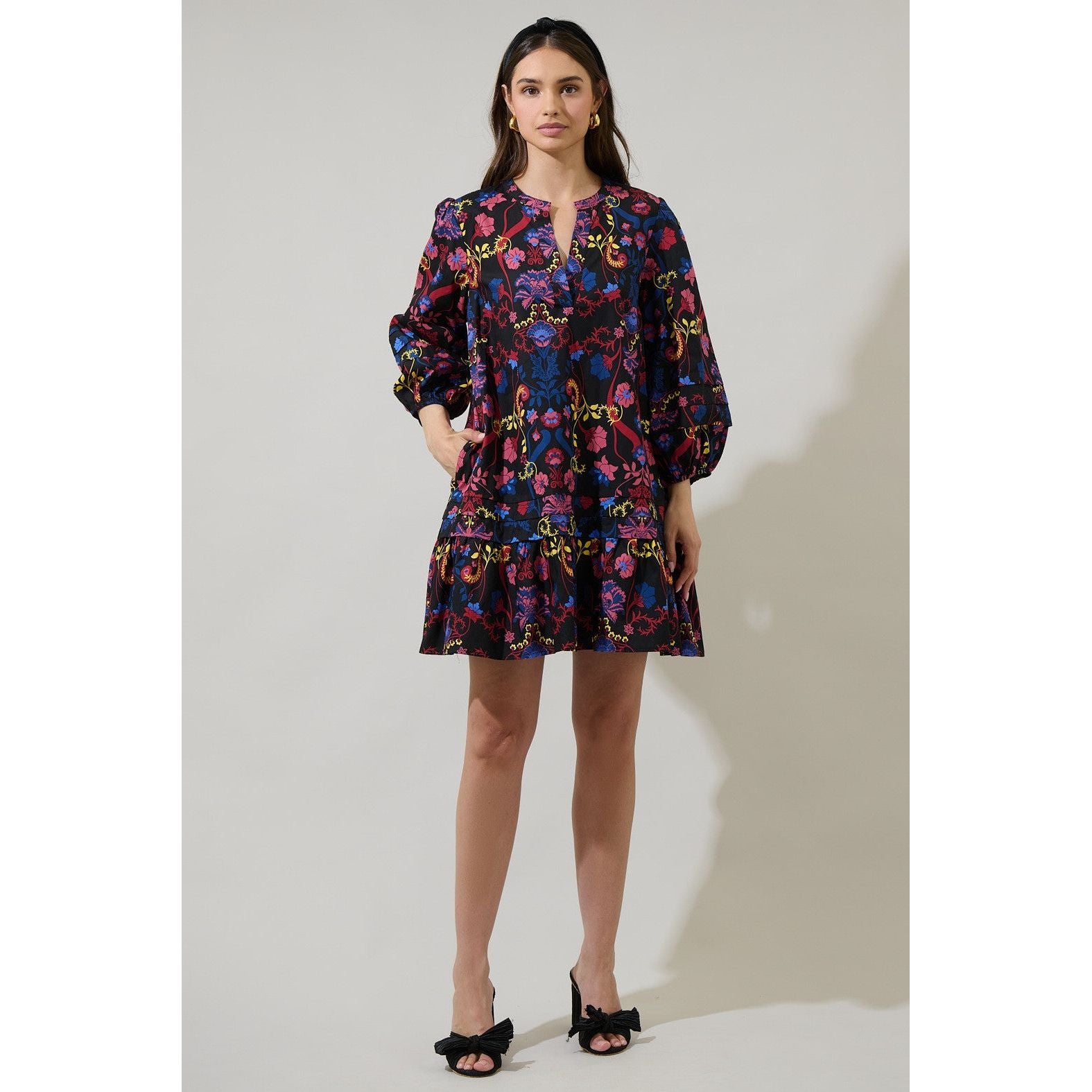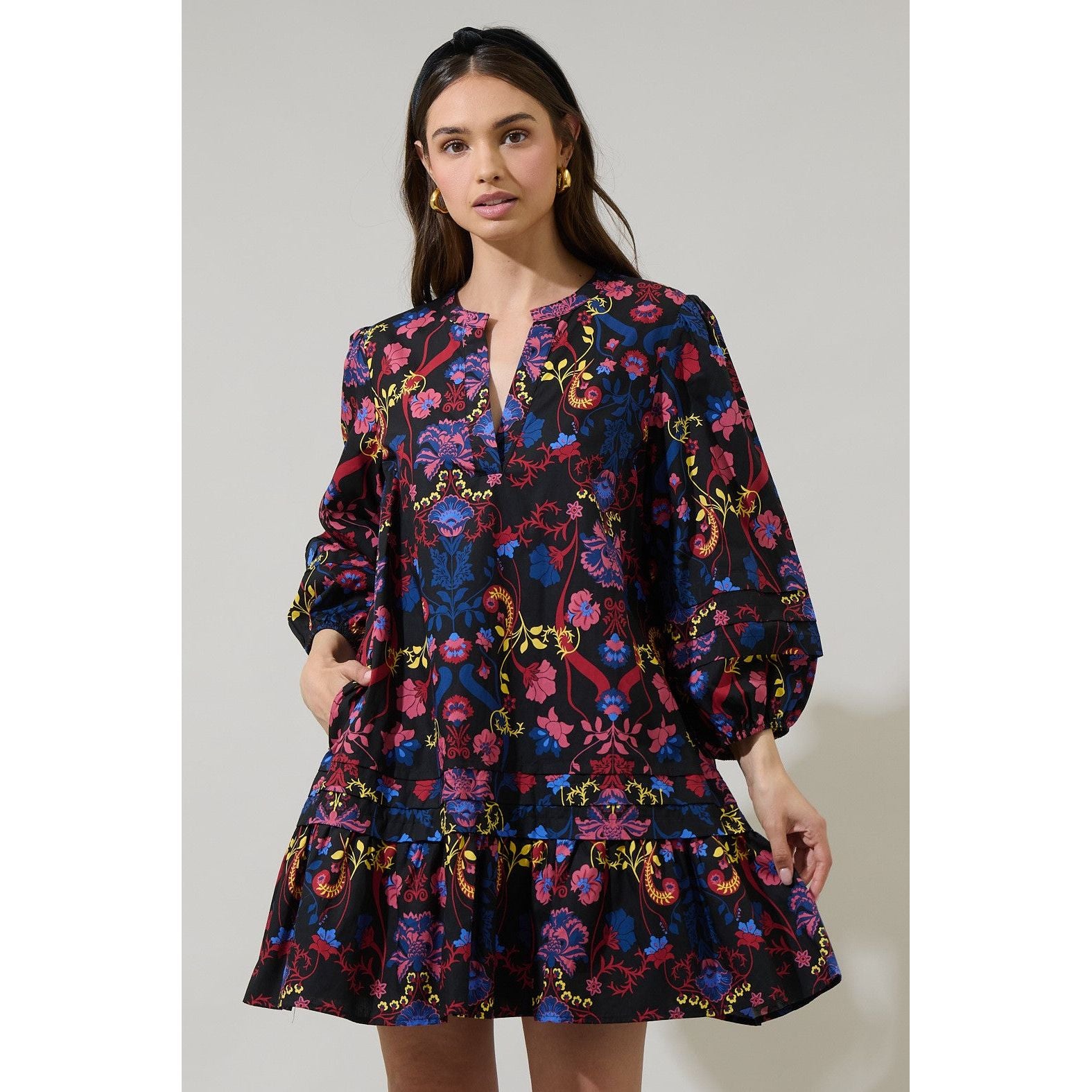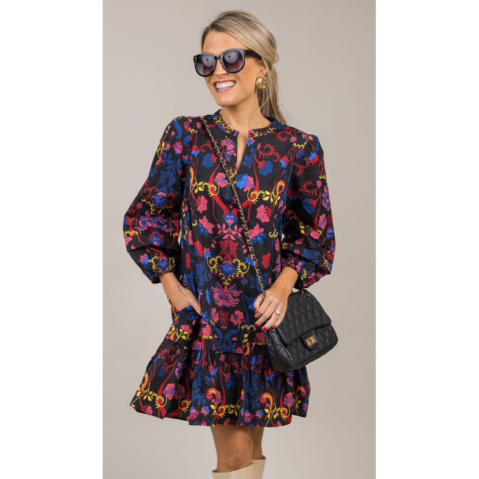 Step out in style with this eye-catching floral dress. The loose, cling-free fit features a split neckline, and pleated details trim the ruffle hem and balloon sleeves. Side pockets complete the look.