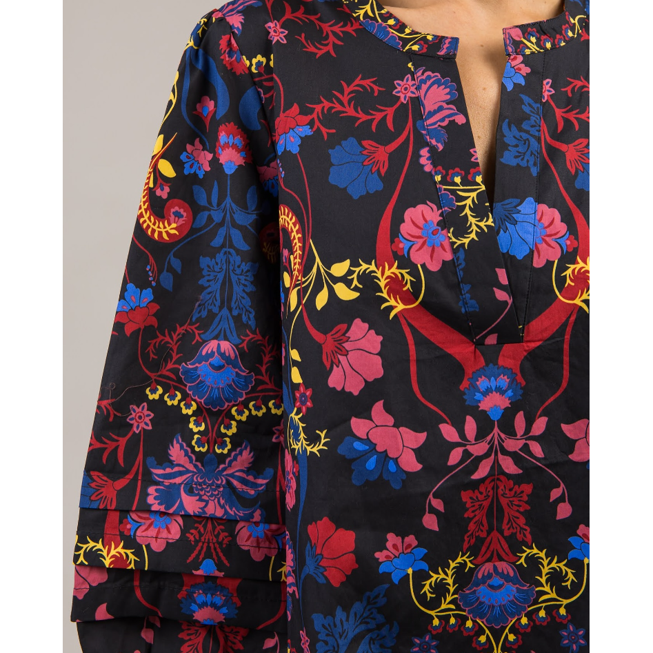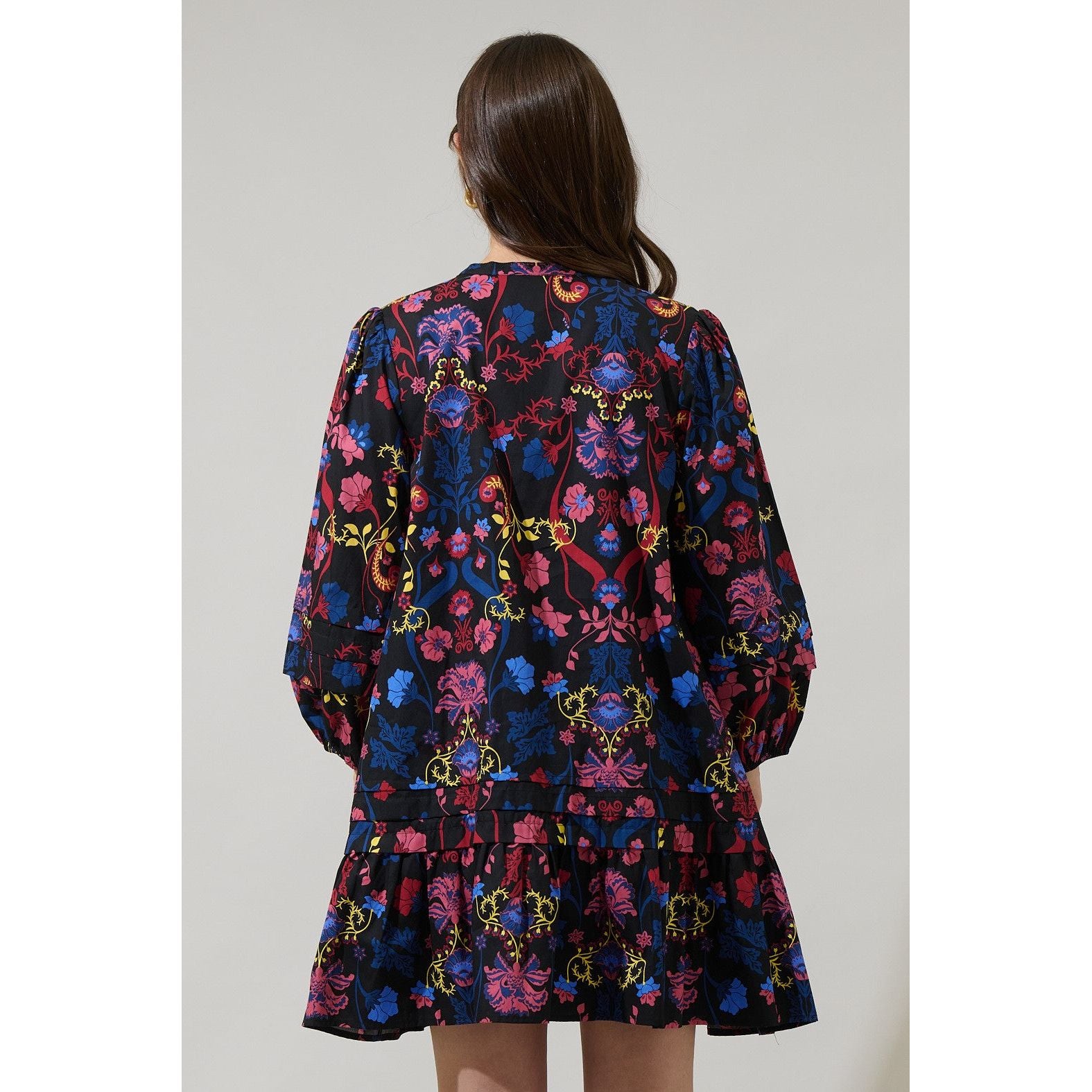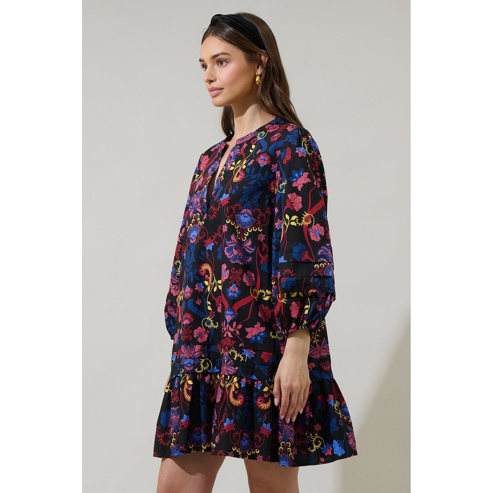 Step out in style with this eye-catching floral dress. The loose, cling-free fit features a split neckline, and pleated details trim the ruffle hem and balloon sleeves. Side pockets complete the look.