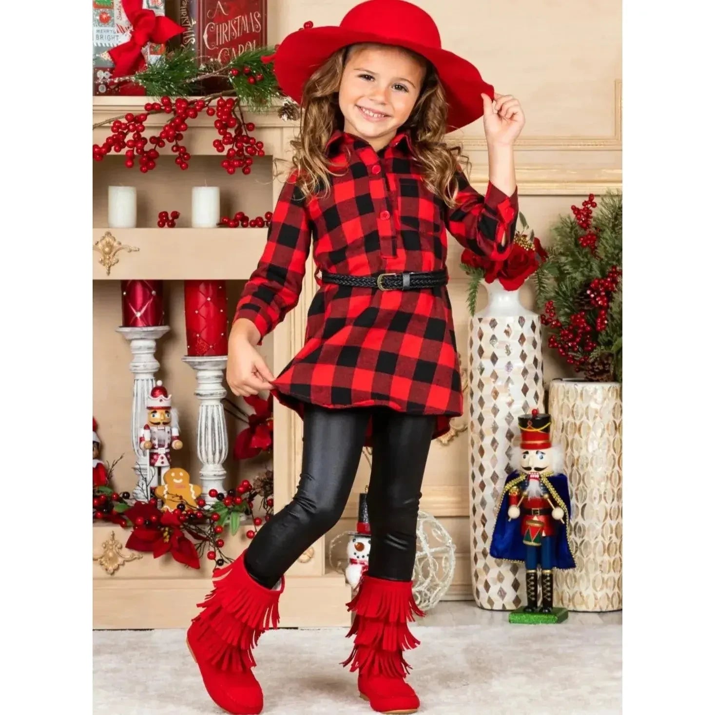 Mia Belle Girls Plaid Belted Blouse & Legging Set
