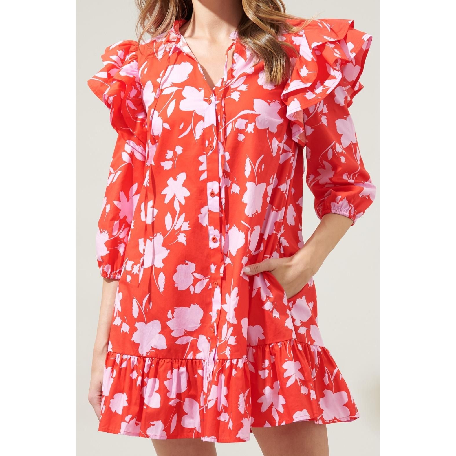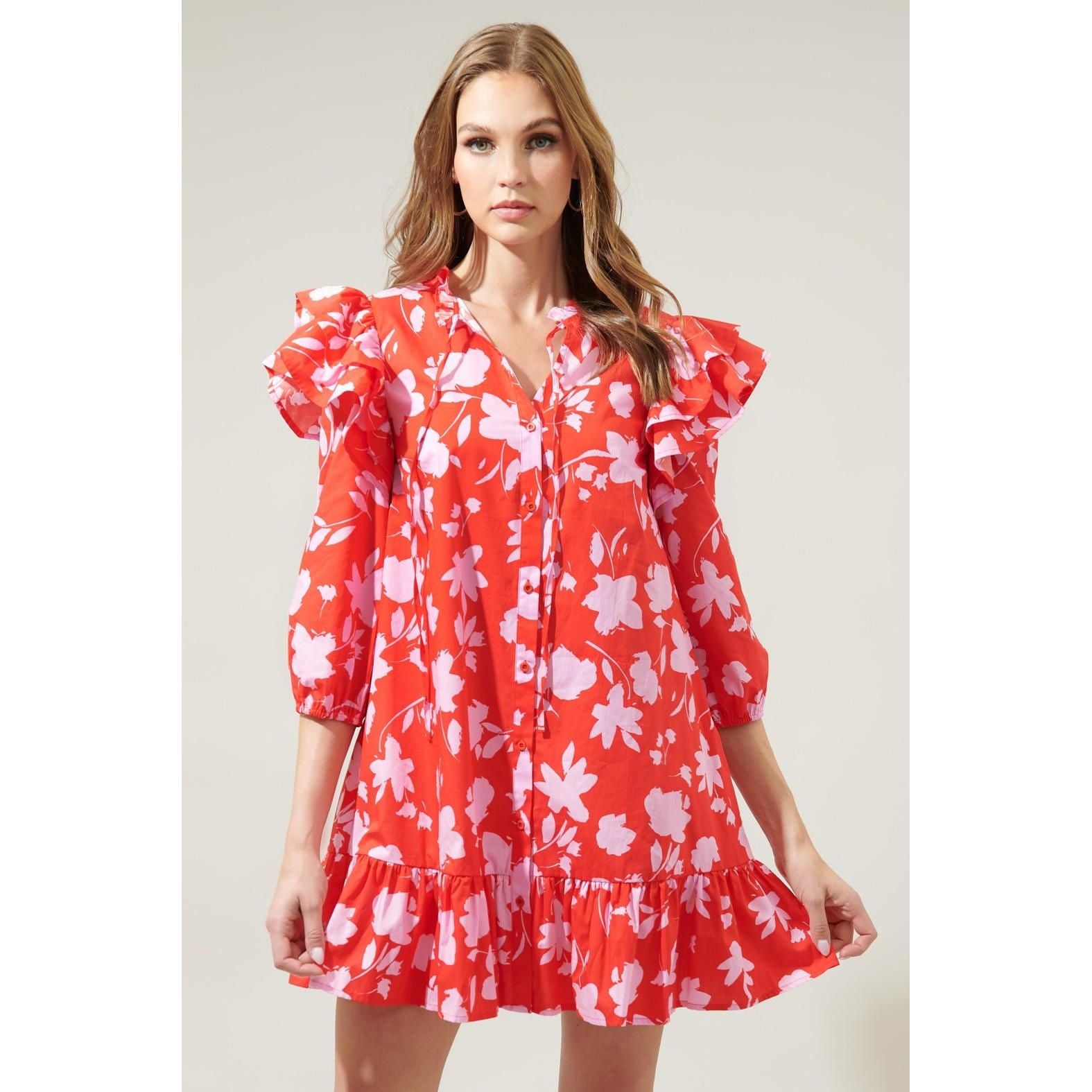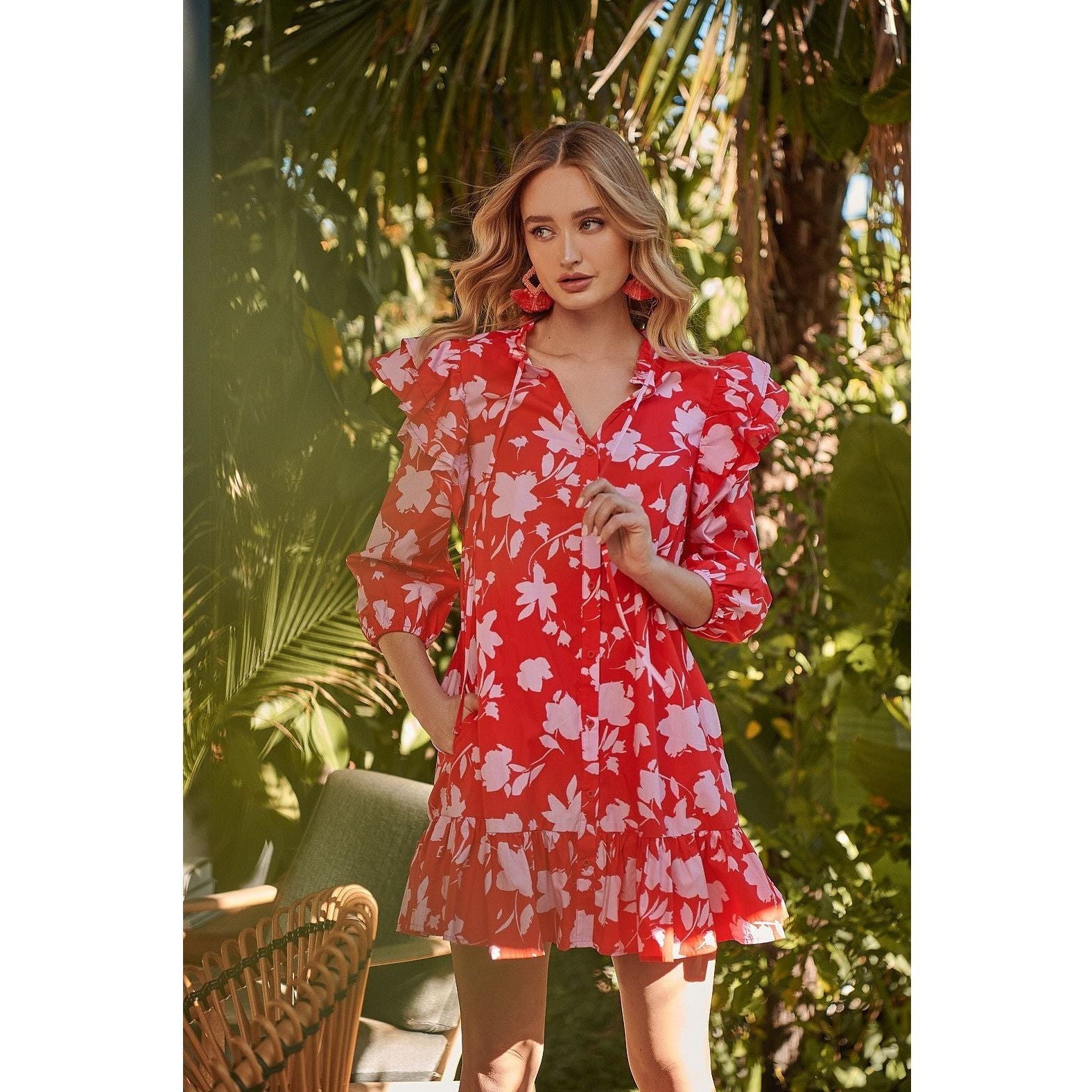 Feel remarkable in the Sunset Floral Sammy Ruffle Drop Waist Dress! Features a fully functional button front detail, sandwiched between ruffle layered extended shoulders and balloon sleeves. The dress maintains a straight fit with a ruffle drop waist. Perfect to wear on your next brunch date with some loafers or heels to get a classy look!