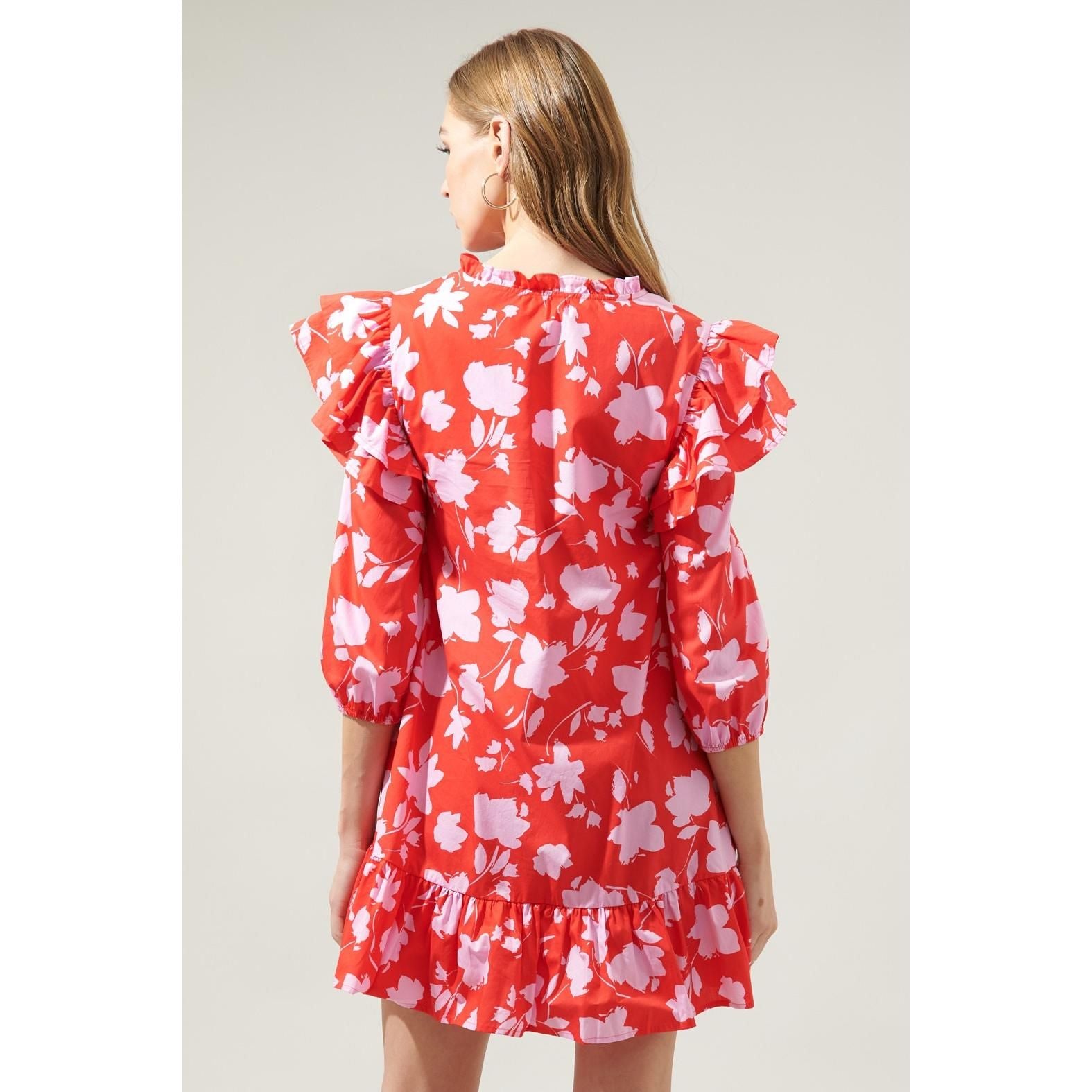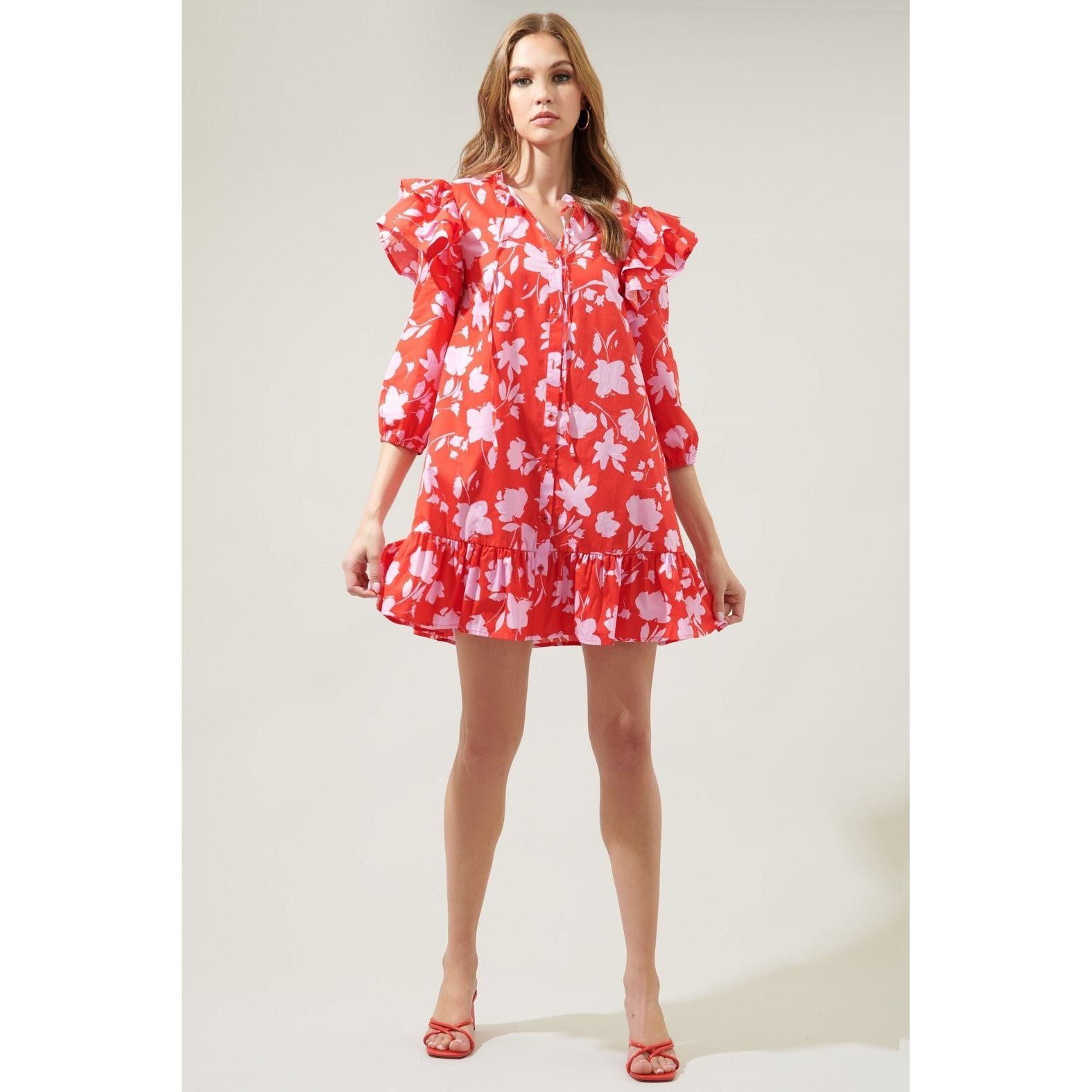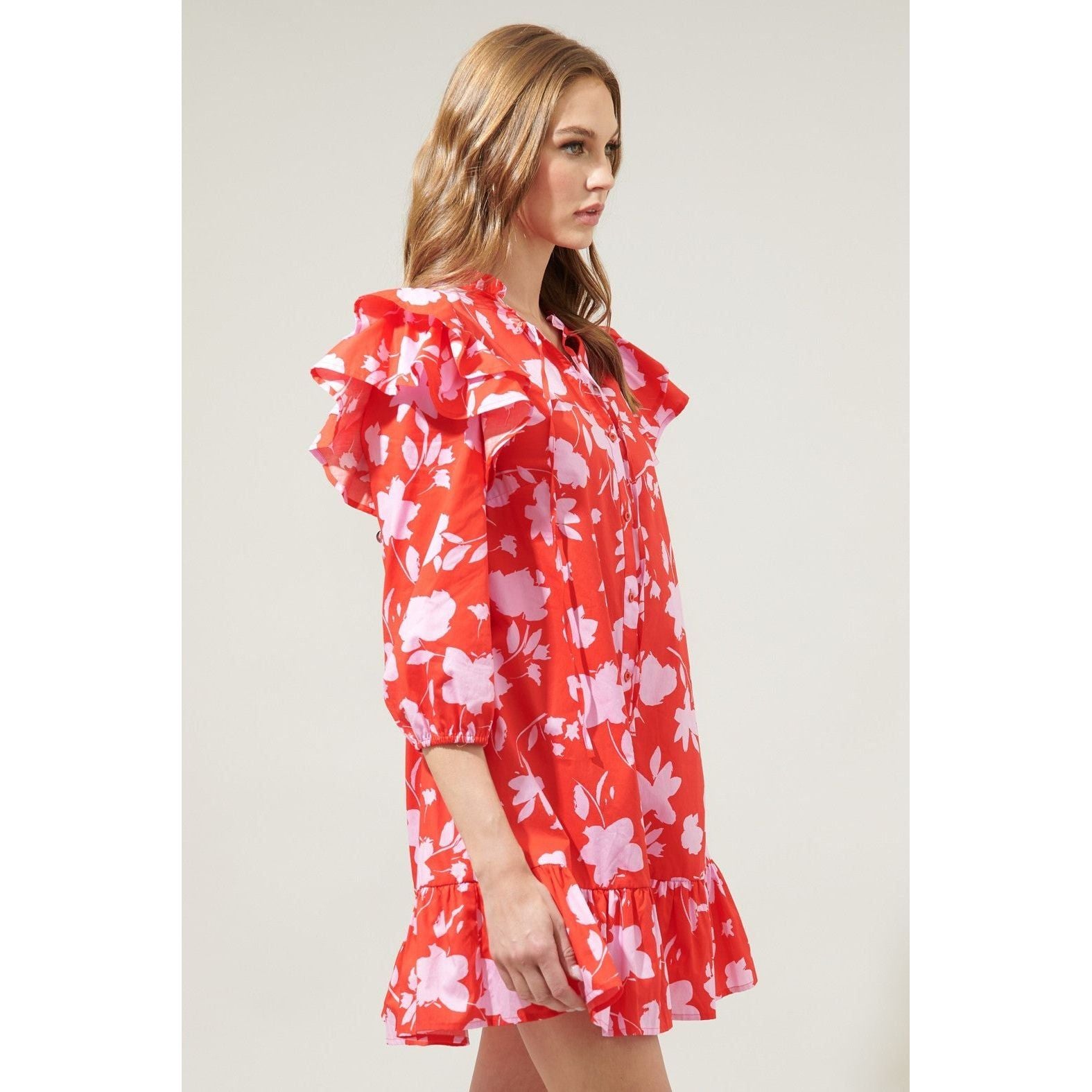 Feel remarkable in the Sunset Floral Sammy Ruffle Drop Waist Dress! Features a fully functional button front detail, sandwiched between ruffle layered extended shoulders and balloon sleeves. The dress maintains a straight fit with a ruffle drop waist. Perfect to wear on your next brunch date with some loafers or heels to get a classy look!
