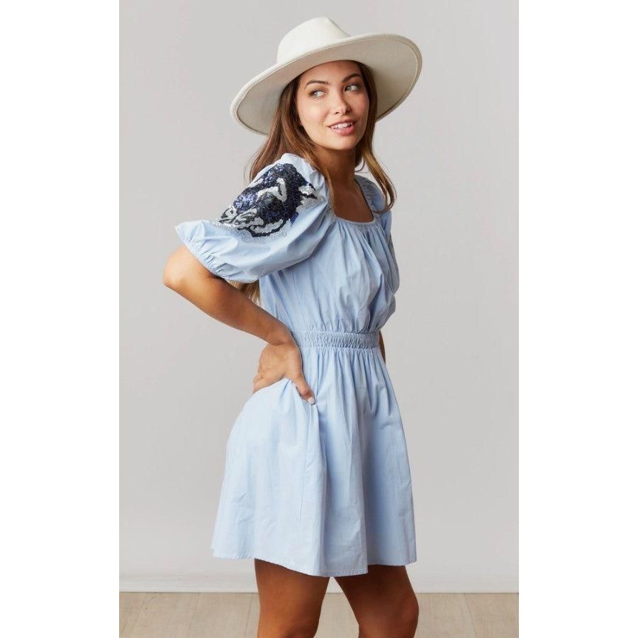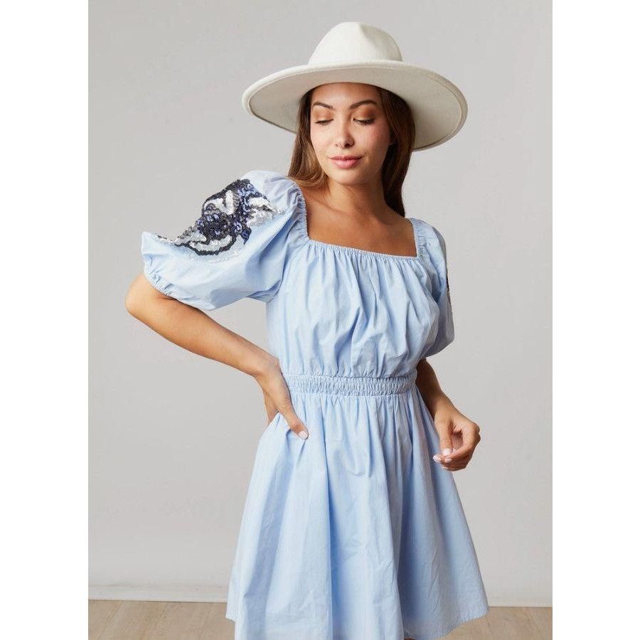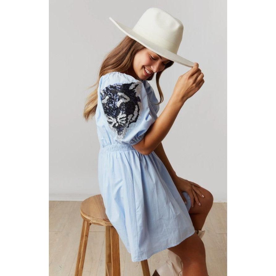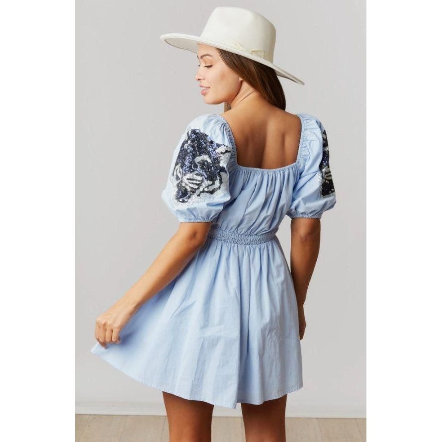 Cute and on trend skater mini dress with sequined tiger patches on the puffed sleeves. Elastic waist. Square neckline.
