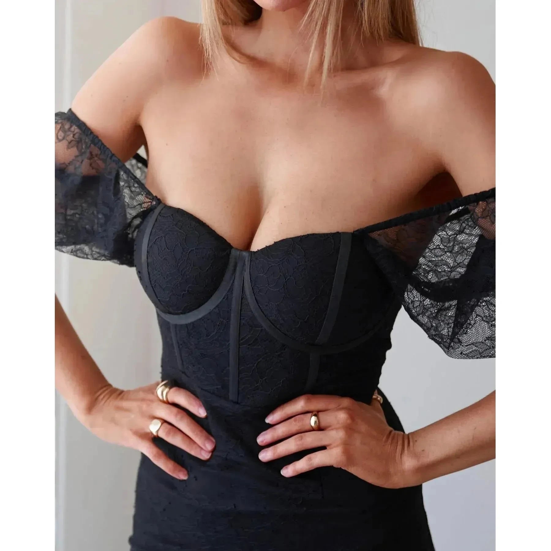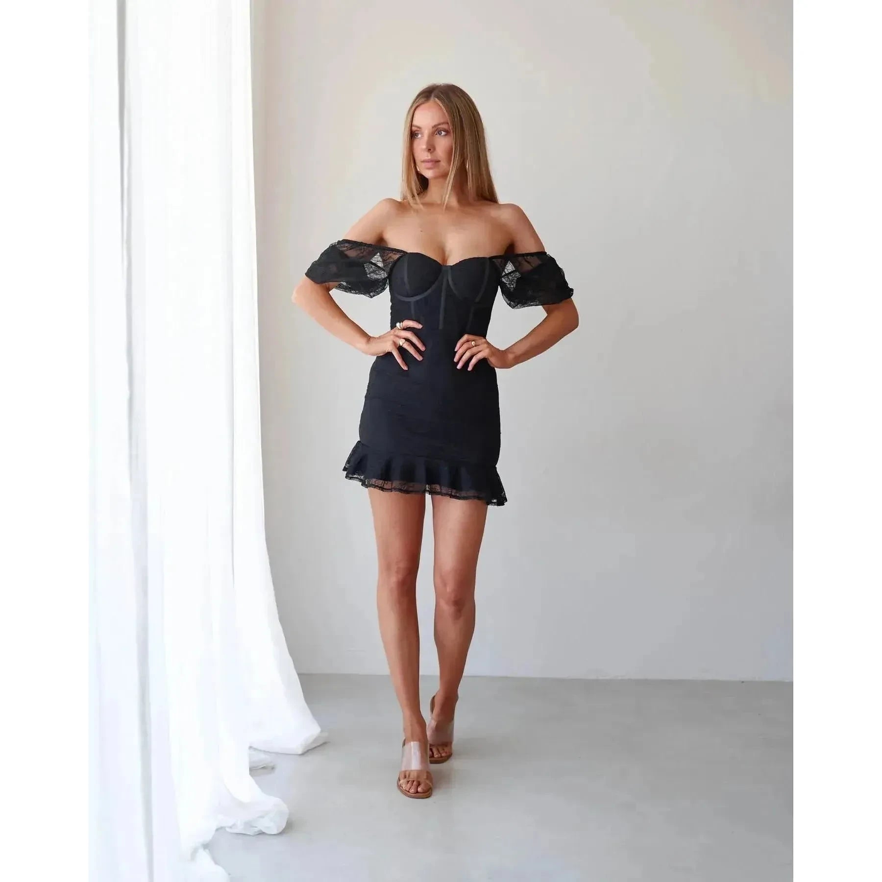 The Caddy Dress is a stunning mini with sheer sleeves, bustier bodice and lace-up back. This figure-hugging number is overlaid by delicate lace - and what more - it can even be worn off-shoulder! Your go-to party dress! Pair with boots and a jacket for that city chic vibe.