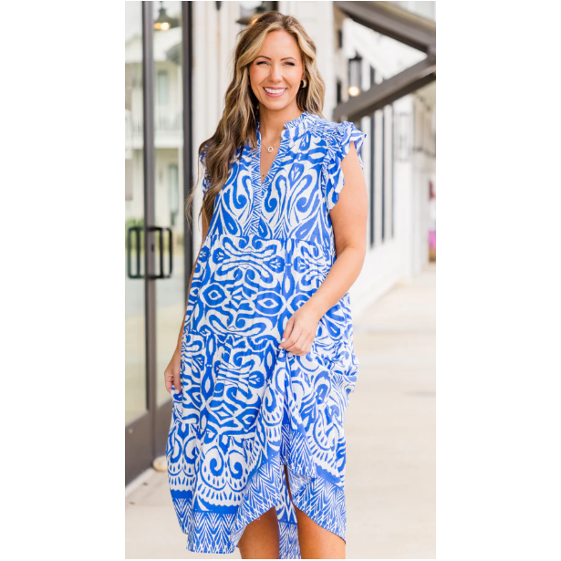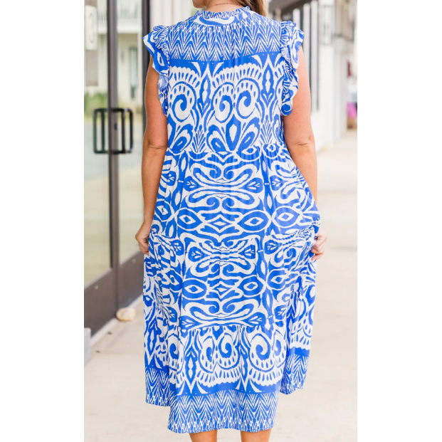 V-neck collared print tiered a-line ruffle midi dress. This Umgee dress features a tiered design, midi length, ruffled short sleeves, and a collared split neckline.