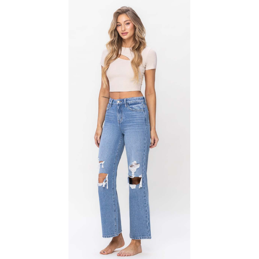 Effortlessly cool and endlessly versatile, these high-rise straight-leg jeans exude casual chic with their distressed knees, adding a hint of edge to your ensemble. Embrace laid-back sophistication and style these jeans effortlessly for any occasion, whether it's a casual day out or a night on the town.