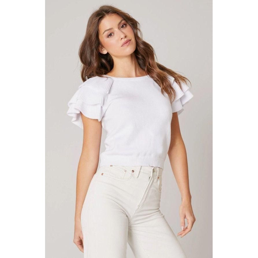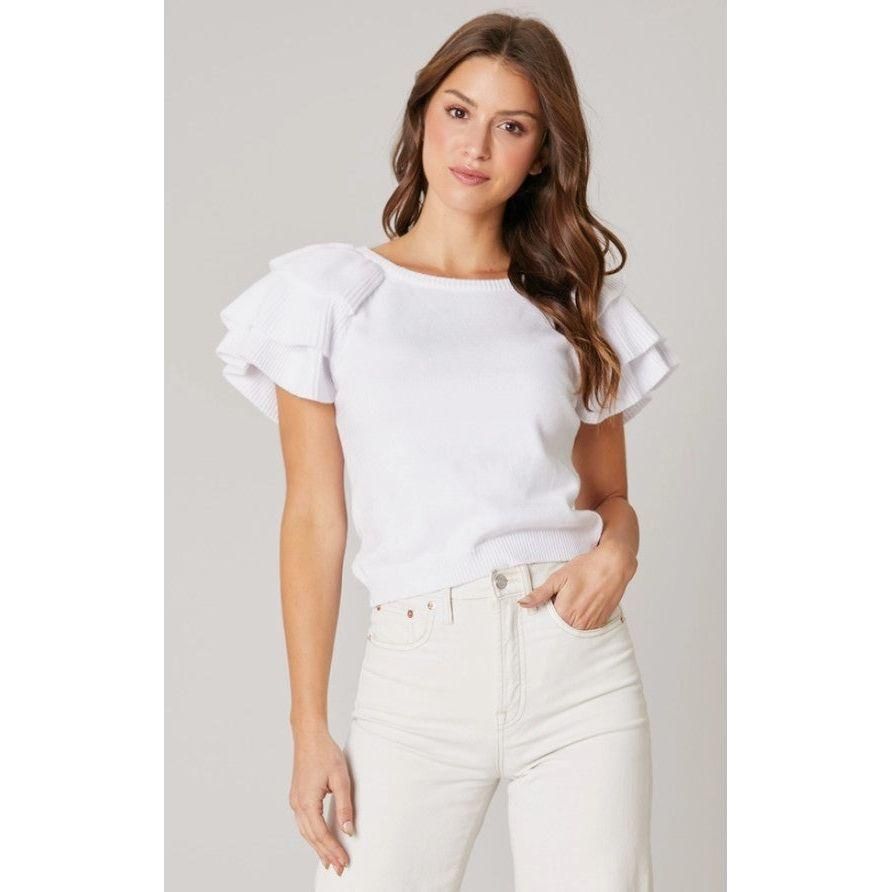 Major preppy vibes in this short sleeve sweater top. Features a classic round neck with ruffle layer shoulders. It maintains a classic fit and is slightly cropped. Pair it with high waisted bottoms and sneakers for a balanced look.